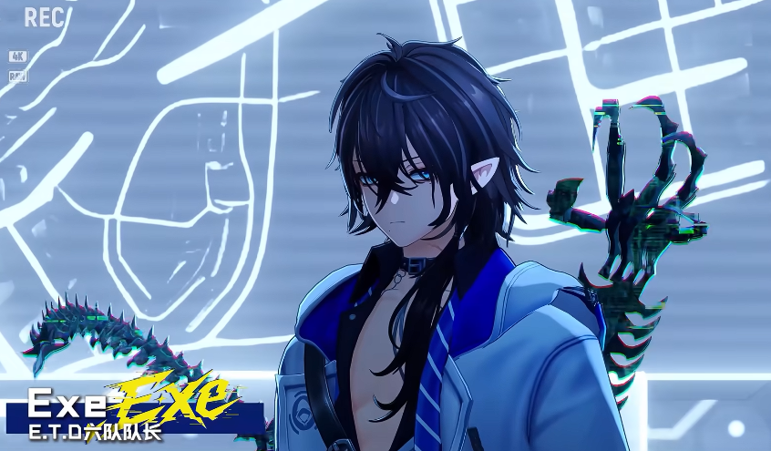 接下来是EXE,这个角色其实是有一些赛博朋克风格的元素在,在他出现的场景当中科技感直接拉满,和他的角色定位PV里展示的画面也比较符合,他的核心能力是能操控具象化的龙形数据体,还能短暂进入折叠空间执行异象清除任务,这种能力听起来比较特别,而且他的信息卡全是问号字段,旁边还有明显的黑客徽标,再结合他的名字,不难看出他拥有系统类似的干预权限,估计后续版本当中也会强化他程序执行者的身份,可玩性是非常高的。