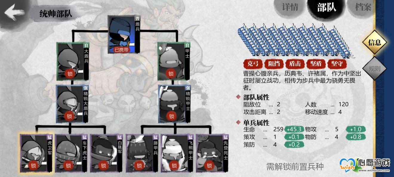 盾兵要的就是能抗伤害,所有盾兵里面虎卫军是最能抗的一个兵种,也是综合属性比较全面,有一些盾兵都是带输出类型并没有什么用。
