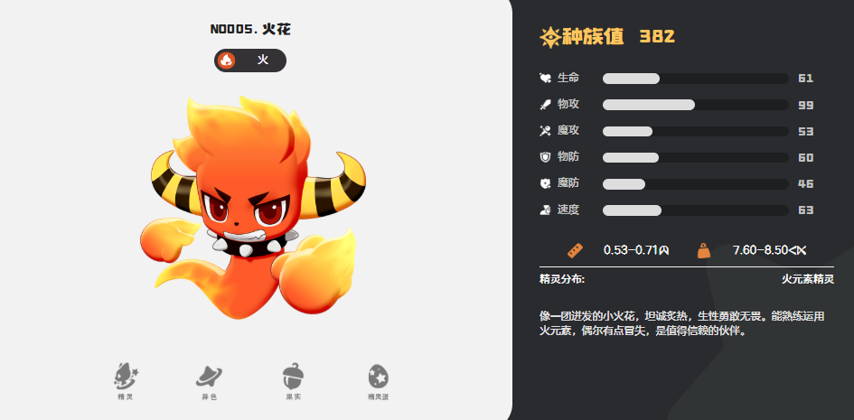 一般情况下开局能选的精灵就三只,要从火花、喵喵、水蓝蓝这三只里面选,这都是游戏系统直接赠送的新手的,而且每一只都有自己的特色,他们的元素也对应了不同的战斗风格,大家可以根据自己平时更喜欢的元素来选,先说说火花,它是火属性里潜力非常高的一个宠物,非常适合走高爆发的火系流派,定位是速攻型角色,组队的时候妥妥的主C核心,不管是什么样的阵容当中这个精灵都可以扛起队伍的输出,而且火花有个超实用的助燃机制,只要释放了火属性 技能,就能在上面叠加一层助燃状态,每一层助燃状态都能提升15%的伤害,最高的时候是可以叠加三层的,而且在叠满之后伤害会直接提升45%,所以这个时期打出来的火系伤害特别高,清图完全没有问题,就是它在技能搭配方面也有讲究,大家一定要给它带炎爆这类单体爆发技能,既能打单体高额伤害还能带动全队的群体输出,范围技能的话就推荐带燎原火,这样释放技能覆盖的范围才会足够大,伤害也不会低,如果遇到难打的BOSS,大家利用这样的技能就可以叠满助燃再放燎原火,用快节奏的打法来操纵它啦,所以大家如果选火花开局推图节奏会快很多。