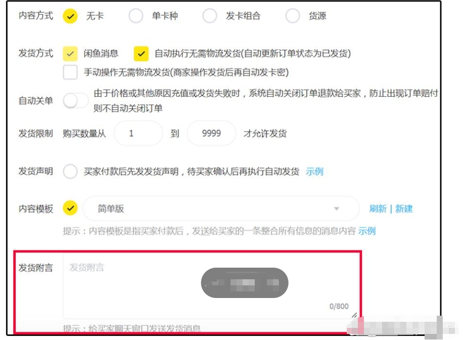 5、根据页面提示,结合自己的需求来进行设置即可。例如:做网盘资源的朋友,只需将对应订单的网盘分享链接复制粘贴到【发货附言】处保存好就OK了。