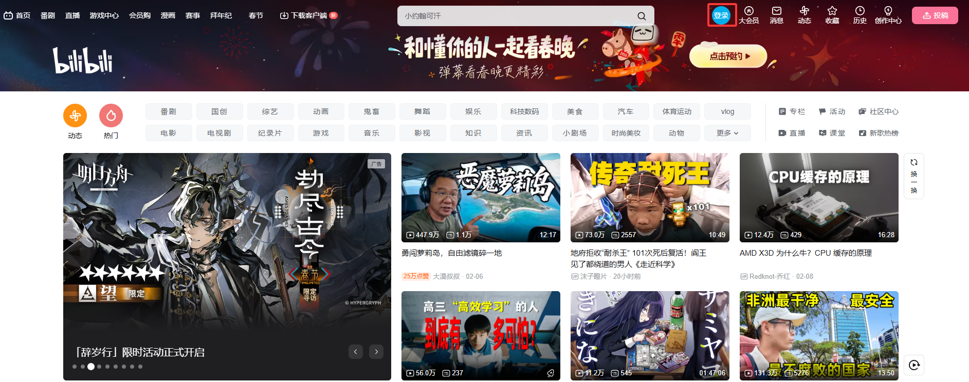 打开浏览器,输入官方地址:https://www.bilibili.com/,进入首页后点击右上角的