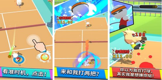 卡通风格所展现,以第3人称的视角将超大的球场环境全部尽收眼底,大家在完成打网球的过程当中,必须要看准时机,通过点击的方式就可以成功发射,只要将自己的球成功越过线,并且对方无法接住,就能获得相应的分数。每个关卡中都有具体的分数要求,大家可以正确来应对,而且还要掌握好回球的时机,成为最强的网球达人。