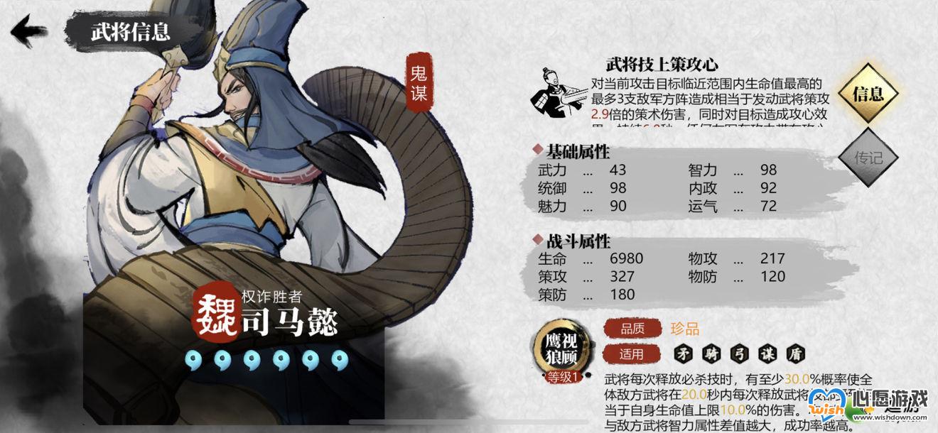 “军师都督队”阵容的必备组件,战法技能都很优秀,面板极高所带来的收益也超高,属于超完美的一类谋士武将。