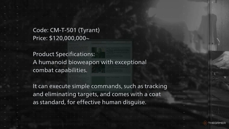 在位于浣熊市废墟下的"方舟"实验室里,玩家可以找到一些终端,里面存有公司内部的产品目录。这份文件日期标注为2026年,包含了该公司向全球军方供应的生化武器的当前报价。其中显示,暴君1.2亿美元、植物43一亿美元、地狱犬3000万美元、舔食者1400万美元。
