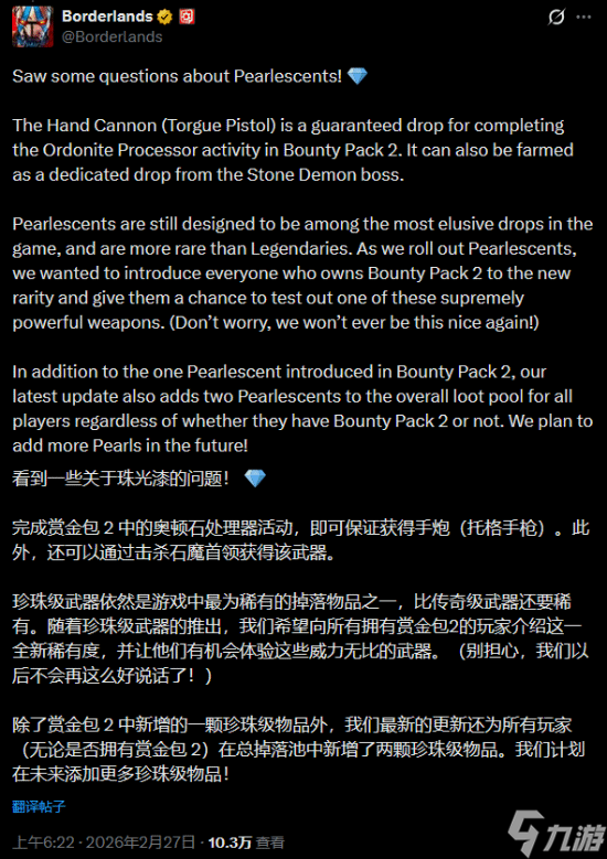 在确认必定掉落珠光武器后,开发商Gearbox也迅速发文解释了这一决定。官方表示,,开发团队“希望让所有拥有赏金包2的玩家都能接触到这一新稀有度,并有机会体验这些极其强力的武器之一”。同时他们也强调,这样的“友好待遇不会再有第二次”,并重申珠光武器“依然被设计为游戏中最难获得的掉落之一”。