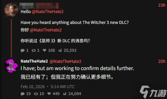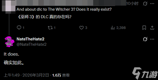 此前我们曾报道,在《巫师3:狂猎》新DLC刚刚传出时,NateTheHate就曾简要提及过此事,但当时,他只是表示已有相关消息,但仍需确认细节。