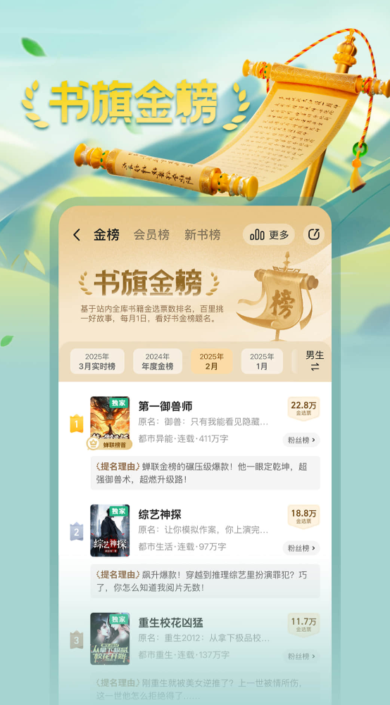 看够了网传无数次被刷的小说?这里有海量原创文学作者提供高分作品,不管是想看言情感人内容还是年度霸道爽文,从此搜到的作品质量都是高档次的,除基本阅读外还提供了讲书服务,从初始章节到最后一个字都能以高拟人感的语音朗读出来。