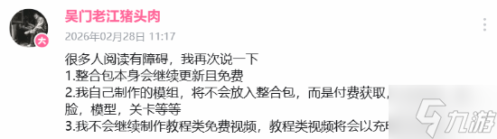 根据其最新发布的公告,未来的内容将划分为免费版与付费模组/会员两部分。老江头特别针对部分读者的误解进行了重点澄清:首先,现有的整合包本体将维持原状,继续保持稳定更新且完全免费;其次,由其个人原创打磨的模组(如高精度材质、定制捏脸、模型及关卡等)将不再内置于免费包中,转为付费获取;最后,原本免费提供的教学视频,未来也将通过平台“充电”等付费形式发布。