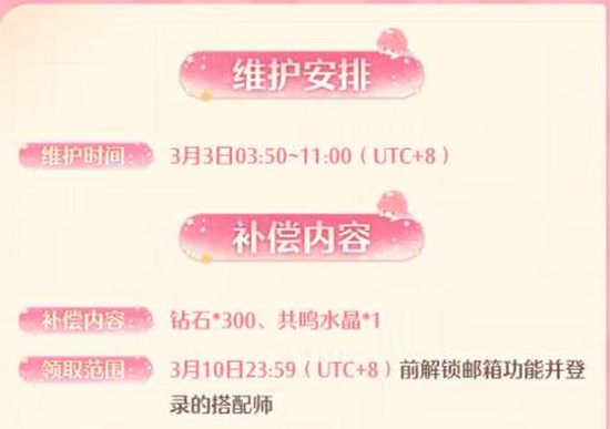 根据官方公告,游戏已于今日03:50~11:00(UTC+8)进行停服维护更新。维护完成后,所有搭配师均可通过邮箱领取【钻石×300、共鸣水晶×1】的停服维护补偿。