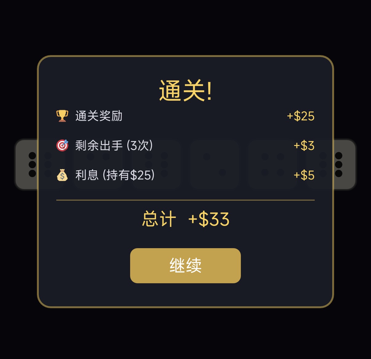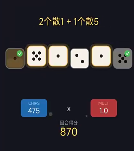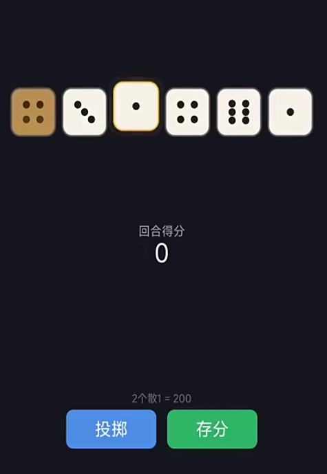 游戏是利用骰子是六面性来展开策略的,玩家进入游戏之后通过投掷6枚骰子来累计积分,1点和5点是关键点位,同时相同的点数越多也能累计更多的积分,达到相应积分才能成功通关。