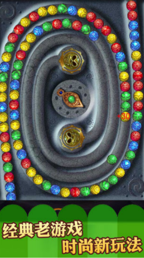 特别复古的泡泡龙消除类玩法,点击开始之后就仿佛回到了曾经的童年时代,从出口将会逐渐涌现出不同颜色的球球,滚动在流畅的轨道中,而正中央又会随机弹出不同颜色的球球,大家通过旋转的方式精准瞄准,将相同颜色的球球放在一起即可快速消除。一次性消除的数量越多,就会让自己的分数逐渐累积,但是却比较考验大家的反应能力,千万不要让这些球球触碰到终点,否则就会导致游戏失败。