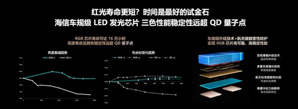 高画质≠高能耗,RGB-Mini LED三色背光发光效率拉满,不用额外补光,能耗比QD-OLED直接降30%。再靠光色同控算法精准控制每颗灯珠,杜绝无效能耗,长期用能省一大笔电费。海信旗下乾照光电还攻克了红色光源技术,红光寿命飙到16万小时,15年不褪色,比普通液晶电视耐用太多。