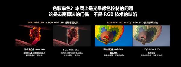 很多人以为RGB-Mini LED和SQD-Mini LED都是Mini LED,差距不大,其实压根是云泥之别!SQD-Mini LED只是单色背光的极端改良,为了高色域加厚色阻层,透光率跌30%,只能靠短波蓝光+大电流补光,最后色彩冲淡、光晕难控、能耗拉满,就是个顾此失彼的妥协方案,全球主流巨头都不跟进,市场认可度低到离谱。
