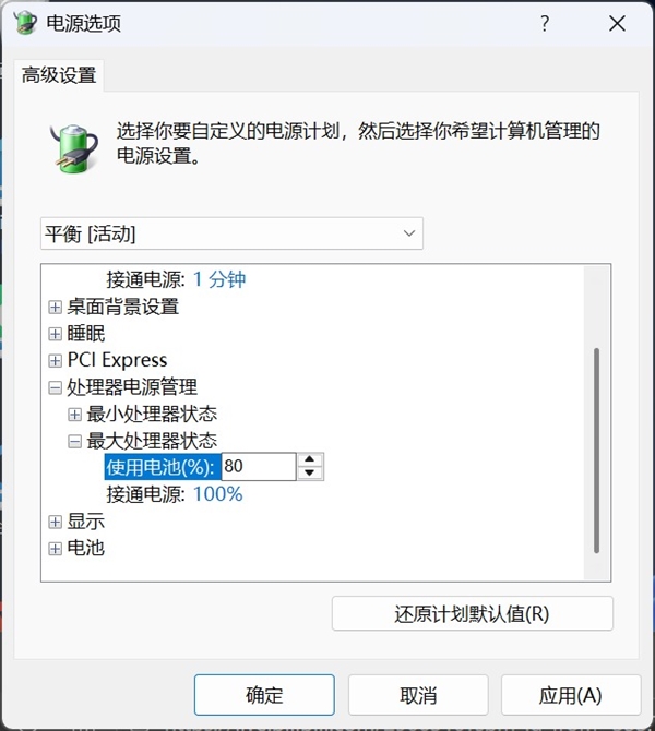调整CPU功耗。进一步优化CPU功耗,避免过度耗电:Windows用户按下Win+R键,输入“control”,打开控制面板,选择“硬件和声音→电源选项→更改计划设置→更改高级电源设置”,展开“处理器电源管理”,将“使用电池时最大处理器状态”从100%调到80%,“最小处理器状态”调到5%,限制处理器的最大功耗上限。
