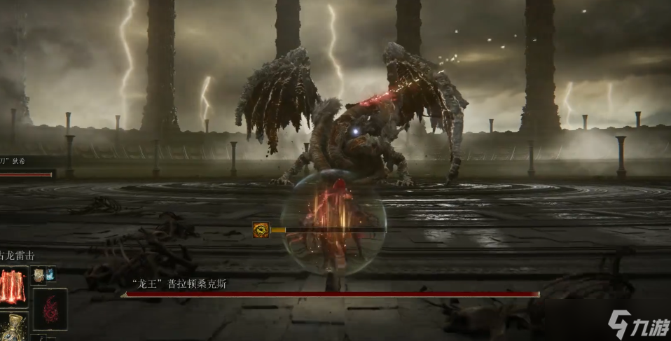 完成躺下交互后,游戏会进入一段过场剧情。时空会发生变化,您将被传送到一个独立的、位于风暴与时空夹缝中的战斗场地。醒来后,您就会直面龙王普拉顿桑克斯,战斗随即触发。这个BOSS被描述为黄金树时代之前的艾尔登之王,拥有巨大的身躯和强烈的攻击欲望,战斗非常具有挑战性。