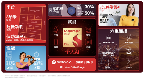 全新骁龙可穿戴平台至尊版引入了首创的多模连接架构,集成六项先进技术:5G RedCap、超低功耗WiFi、蓝牙6.0、UWB、全球导航卫星系统(GNSS)和窄带非地面网络(NBNTN)。