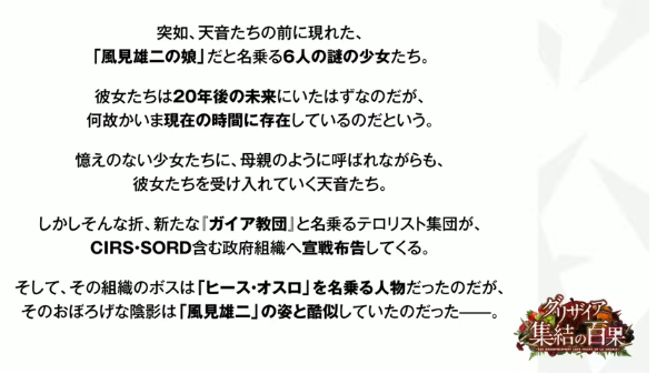 故事围绕六位自称是系列主角风见雄二女儿的神秘少女们展开她们从20年后的未来穿越到现代,出现在周防天音等人面前,虽然天音等人对她们毫无记忆,但仍接纳了这些“女儿”,但是在这种情况下名为“盖亚教团”的恐怖组织向政府机构宣战,其首领和风见雄二的样貌惊人相似,从而引发了一系列关于时空和身份的谜团。