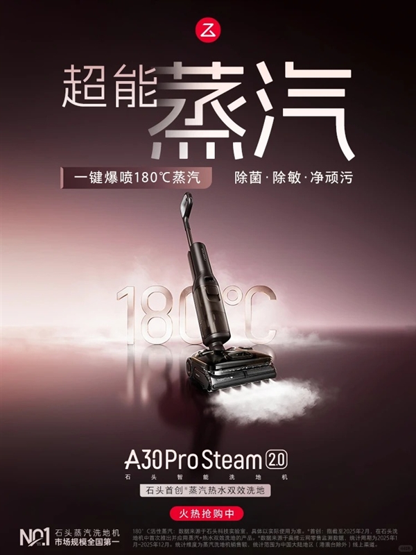 标准不是空中楼阁,需要技术和产品来落地。即将在AWE同台亮相的年度新品——石头洗地机A30 Pro Steam 2.0,正是对这一健康标准的最佳实践。针对细菌安全度,它搭载180℃活性蒸汽与90℃高温活水双效系统,实现物理高温深度清洁,满足母婴家庭对0化学残留的极致需求。针对隐性污染,它配备25000Pa超大吸力系统,吸污、污水分离、自清洁、烘干全流程闭环,有效规避二次污染风险。针对全场景覆盖,薄至12.5cm的机身可实现180°躺平深入床底、沙发底,让家中再无清洁死角。