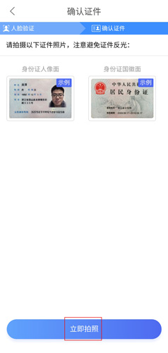 6、接着进行证件验证,点击立即拍照,在将身份证上传之后,就已经完成了,可以立马去拍照了。