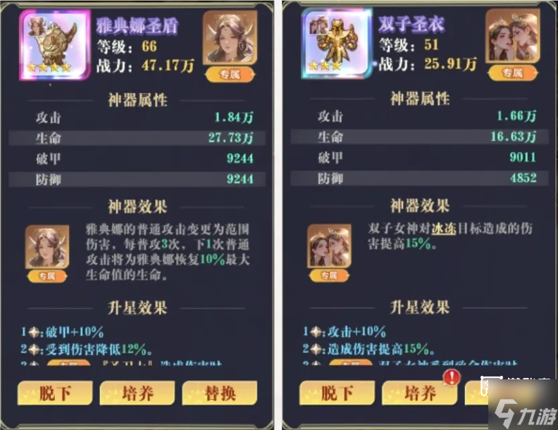 雅典娜带专属神器,双子带3星专属神器补充伤害(3星受到致命伤免疫伤害并恢复生命),处女女神带专属神器提供回血,弗丽嘉低星带神域战衣避免被秒(高星可看情况带专属神器),摩羯女神带神域战衣,雅典娜抗伤多带肉装:自然恩赐+圣芒守护+星雨耳环+黑曜项链,其余女神首饰优先带自然恩赐+闪耀戒指。