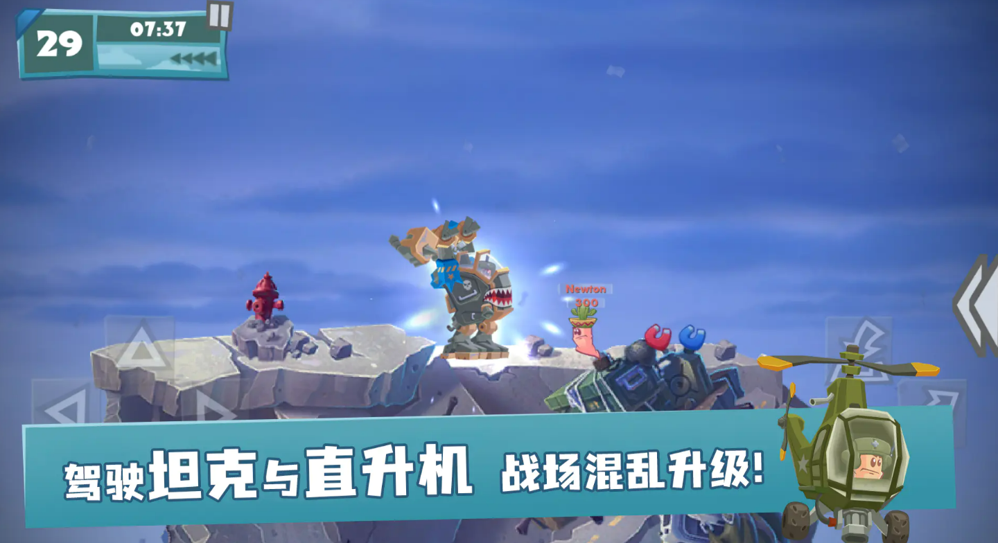 游戏最大的特点之一,是这次加入了载具系统,虫子们可以开坦克、坐直升机,这在以前的系列里是没有的。坦克可以在地面上横冲直撞,直升机则能从空中往下打,玩法上多了一些变化,不只是站在地图上互相扔武器那么简单了。另外建筑物也能进去,躲在里头可以避开一些直接的攻击,打法上需要多想一步,不然容易被人堵在角落里打。