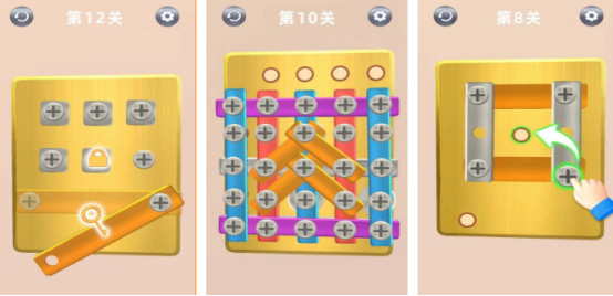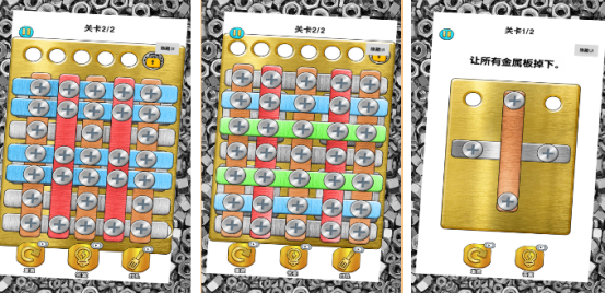 休闲益智闯关游戏主要的核心特色就是模拟螺丝钉的简单操作与策略性相结合,通过触控屏幕旋转螺丝的方式,如将所有螺丝全部解除就能够通关,关卡任务多样,在规定的时间内完成相应的固定数量,遵循特定的顺序来拔出螺丝,考验玩家的注意力和对节奏的把控。需分析机关结构,寻找隐藏的螺丝拆解线索,最终推理正确的操作顺序。