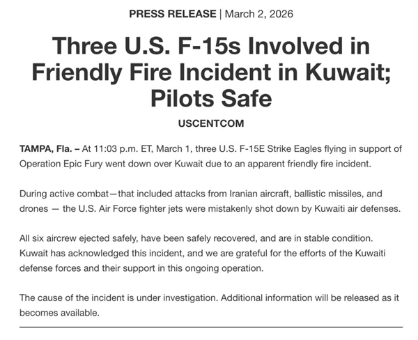 随后,据人民日报微博引述美国中央司令部消息,3架美军F-15E战斗机在科威特因“疑似误击事件”坠毁。击落它们的,竟然是科威特防空部队装备的爱国者防空导弹。