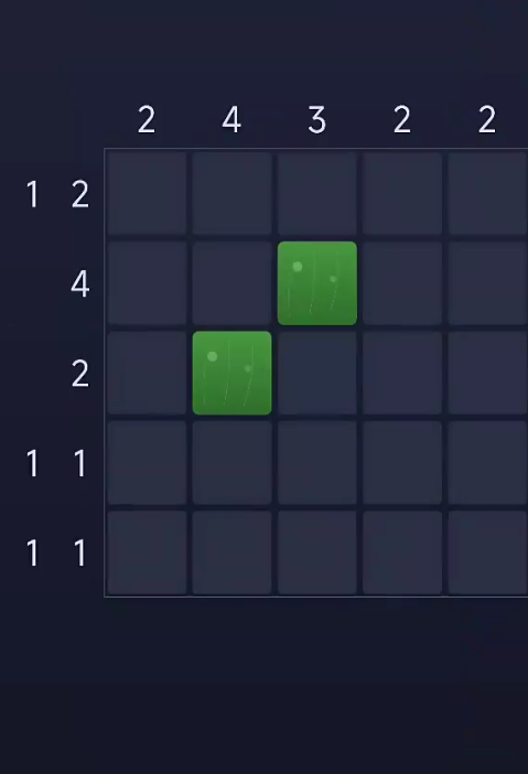 每组数字代表对应行列中连续涂色格子的长度与段落数。例如“3 2”表示该行(或列)存在两段涂色区域,第一段长3格、第二段长2格,且两段之间至少间隔1格空白。通过交叉验证行列线索,逐步排除不可能位置,最终还原完整图案。