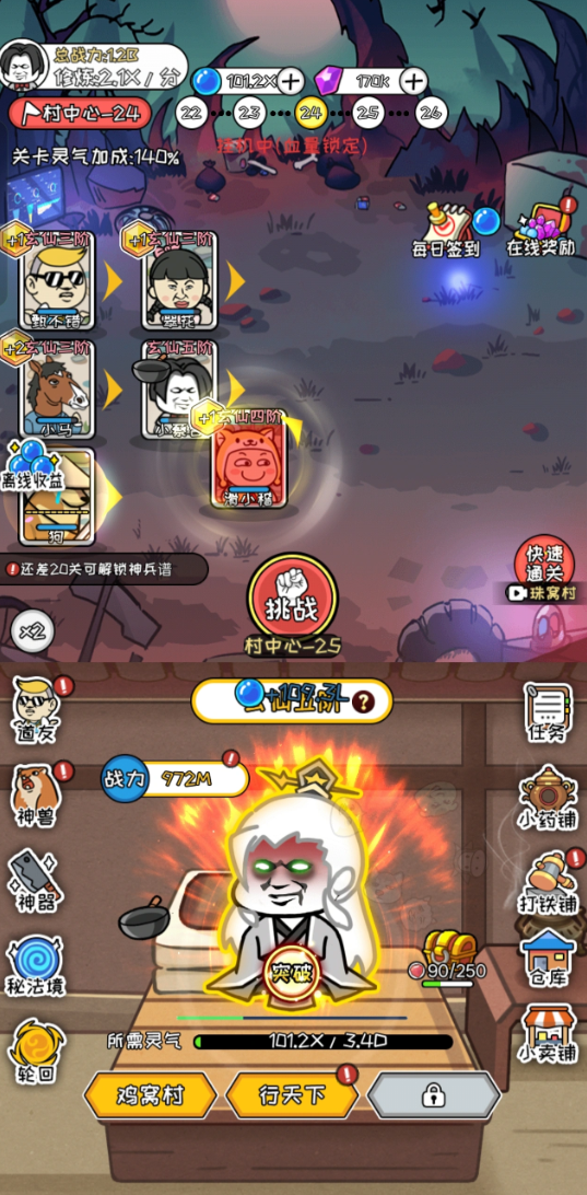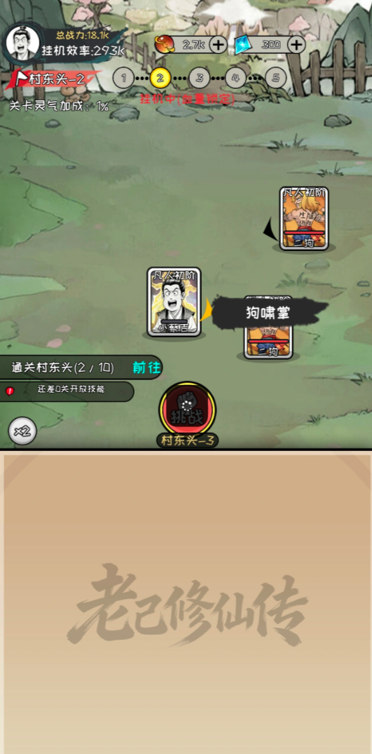 刚刚开局,主角“小蔡吉”只是个凡人,凡到不能再凡的那种,但玩家可以通过操控主人公移动打怪,取得敌怪的灵气,一步步从练气到筑基,从金丹到元婴一步步升得金仙——这都是后话了,更要紧的是解锁围绕在操控角色身边的”任务“、”铁匠铺“、”小药铺“等神级按键。开局还要检查自己第一世的资质,灵根是否是单属性灵根,心境是否经过考验,这都是升仙路上必看的消息......就从接下二狗的一发“狗啸掌“启动修仙之路吧~