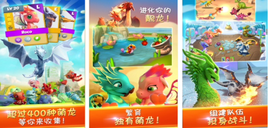 繁育萌龙是主要的玩法,也是核心内容,收集超过700多种不同属性的龙,包括强风以及植物等,收集之后可以自由繁育,最终打造出上千种不同的朦胧形态,喂食的方式提升等级解锁技能,通过抚摸互动的方式增加亲密度,在战斗方面采用3v3回合战斗玩法,战斗模式更是多种多样,包括冒险关卡和远古世界挑战等。