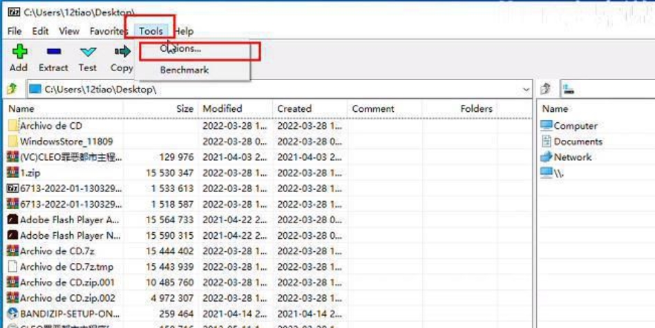 1、运行7zip软件,点击上方菜单栏中的"Tools”,接着点击下方选项列表中的"options"。