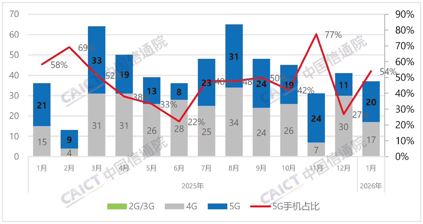 新机型上市方面,2026年1月国内手机上市新机型37款,同比实现2.8%的小幅增长,不过5G手机新机型上市量出现下滑,当月5G手机上市新机型20款,同比下降4.8%,占同期手机上市新机型数量的54.1%。