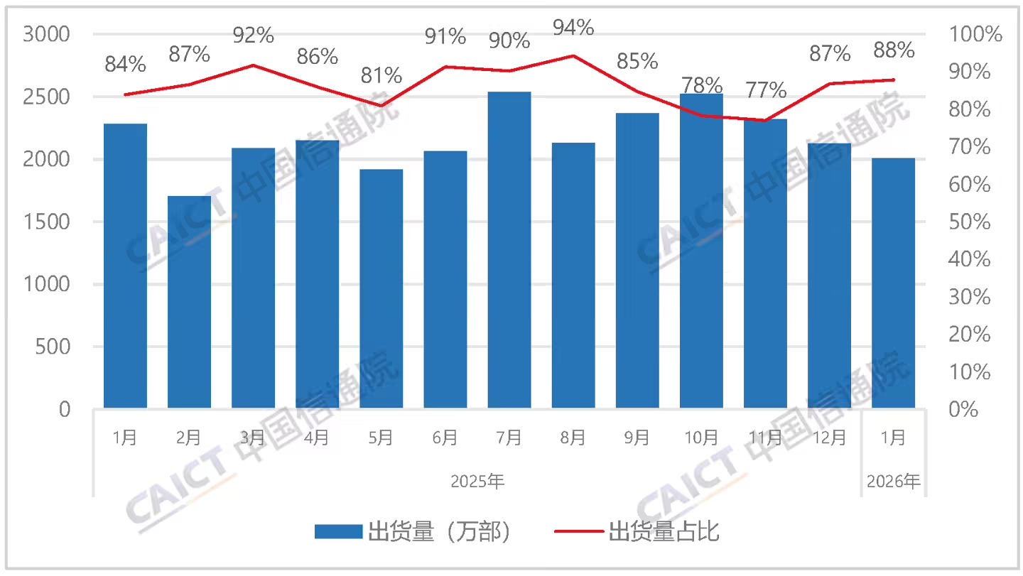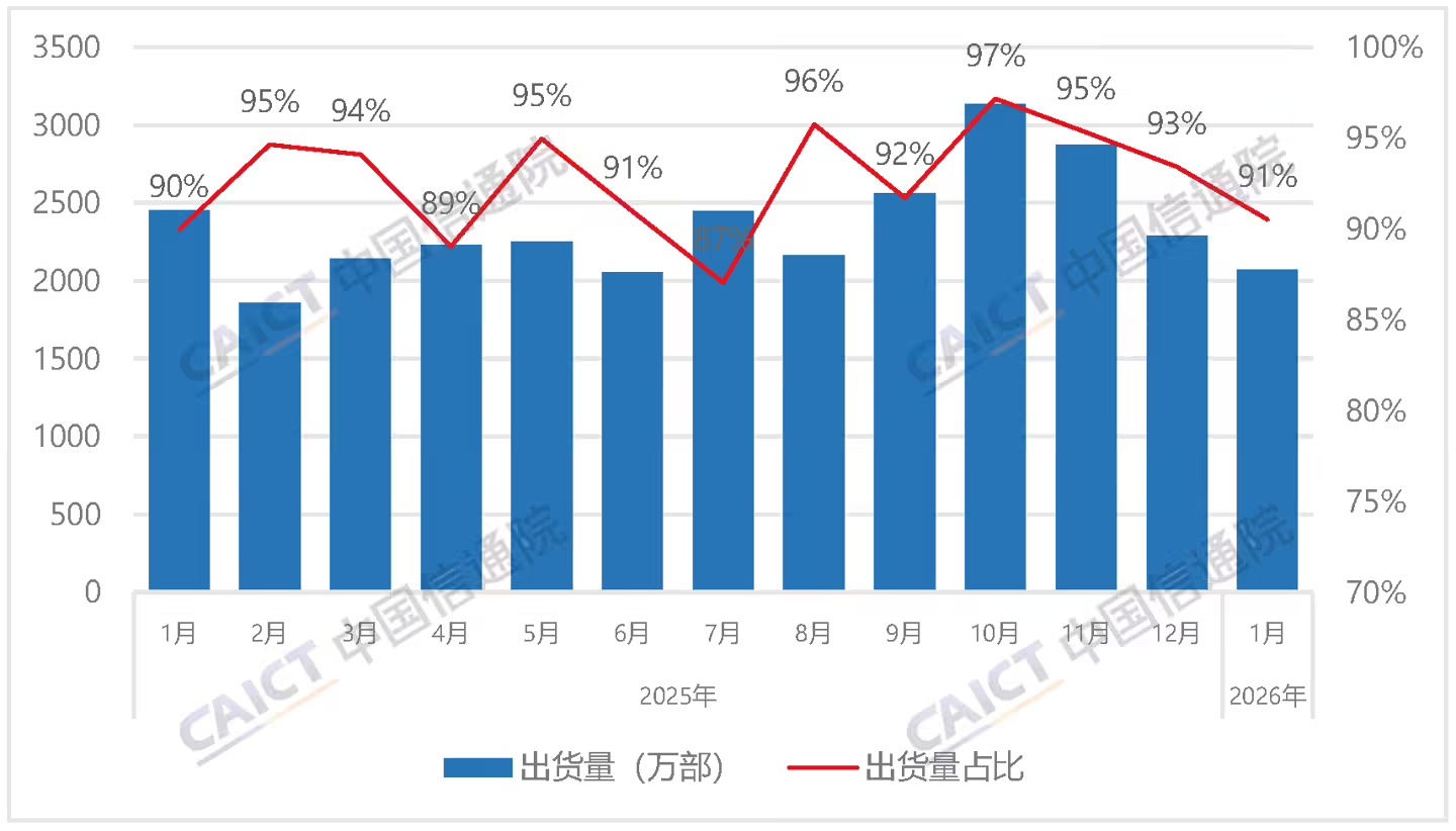 中国信通院:2026年首月国内手机出货量同比下滑16.1%,国产品牌占比近九成
