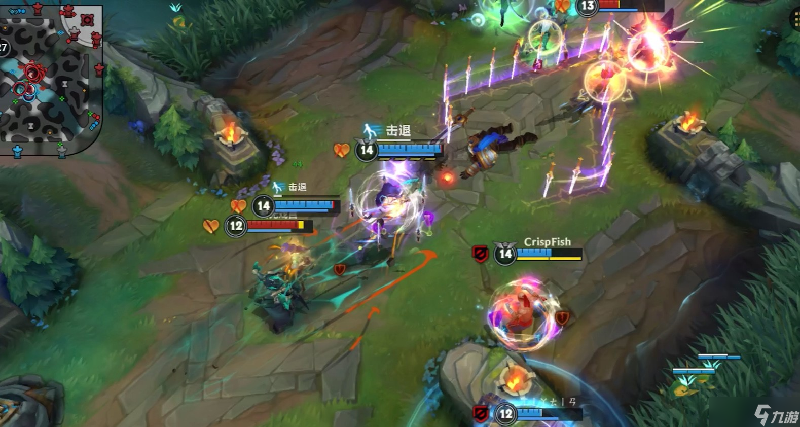 除了常规的上下分路,刀妹在下路担任物理输出核心也是一种具备独特战术价值的打法选择。这一思路主要围绕其一到三级和六级这几个关键强势期来构建,一级时她可以利用小兵快速叠加被动层数并突进拉近距离发起换血。三级后,在点燃的加持下,通过E技能先手眩晕接上完整的QA连招,具备很高的击杀概率。六级后大招若能先手命中目标,接下来的追击能力极强。这种下路打法对辅助英雄的配合与阵容整体衔接有较高要求,并且与传统射手相比,刀妹在游戏后期的持续输出环境与射程劣势较为明显,需要团队在团战阵型上做出相应调整。