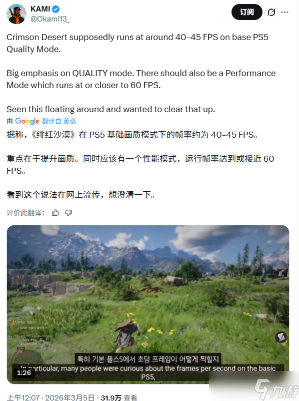 《红色沙漠》PS5质量模式是40-45FPS,而非30FPS: