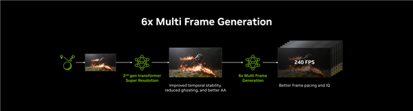 DLSS 4.5技术采用全新6倍多帧生成模式,实现了流畅度的巨大飞跃!凭借第二代 Transformer模型的出色图像稳定性,结合帧率控制与画质的优化,DLSS 4.5技术可为每个渲染帧额外生成多达5帧,实现最高6倍的帧率提升!