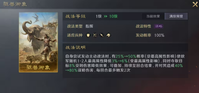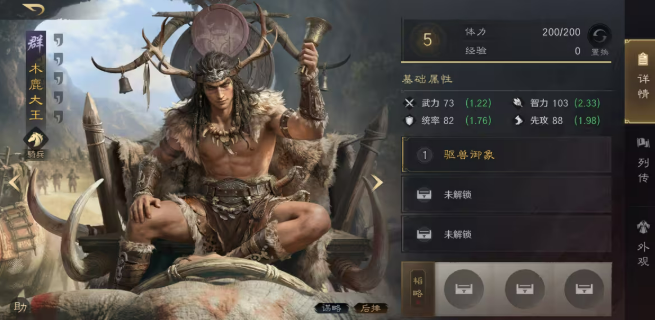 木鹿大王为智力型辅助武将,智力初始103,成长2.33,统率82,先攻88,适配全先攻加点策略,骑兵兵种赋予其对盾兵的抗性优势,但需防范姜维、王异等枪兵武将的克制。其核心技能具备三重功能性:首段随机降低1–2名敌方目标最高属性6%,可多次叠加;第二段夺取目标8%减伤效果转移至己方,同步施加8%易伤;第三段附加一段谋略伤害,用于破除抵御。单回合理论上限为对两名目标各触发两次,合计达成双目标16%易伤+己方32%减伤。触发判定仅需主动战法“尝试发动”,无需实际生效,且属性降低可联动孟获“借刀”机制。