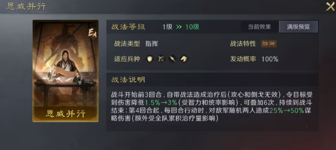 战法【恩威并行】适配以治疗为轴心的阵容,尤其契合刘备薪火枪体系。与自带稳定治疗的武将协同时收益最大化——例如刘备每回合四段治疗,可充分激活该战法三层减伤(前三回合每次治疗后触发)与后续谋略输出(第四回合起每回合攻击两人)。伤害部分受全队累计治疗量加成,实现前期承伤、后期补足输出的双重职能。