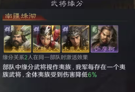 缘分方面,两人即可激活基础效果;三名夷族武将同队时,全队常驻18%减伤,相当于额外获得一位曹操级减伤单位;金书解锁后,同步附带兵力回复效果,防御维度全面覆盖。推荐配置为木鹿大王全先攻+雁型阵,协同孟获(借刀)、祝融夫人(兵刃输出),激活南疆烽烟后,18%减伤叠加巫医古卷治疗,队伍生存与续航能力达到当前赛季一线水准。此外,该阵容可释放诸葛亮资源,用于其他主力队伍,多线作战调度空间大幅提升。