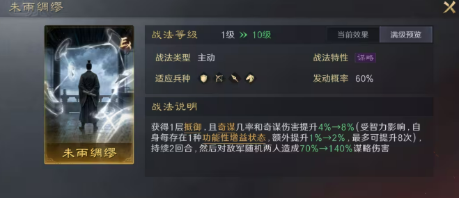 【未雨绸缪】专为高智力谋略武将设计,发动即提供1层抵御,并同步提升奇谋发动概率与奇谋伤害。增益状态(如清醒、必中、破御、抵御等)数量越多,提升幅度越高。司马懿为其最优适配对象:叠满8层布阵后,仅保底即可获得24%奇谋概率与奇谋伤害加成,叠加智力属性转化,综合收益极为突出。