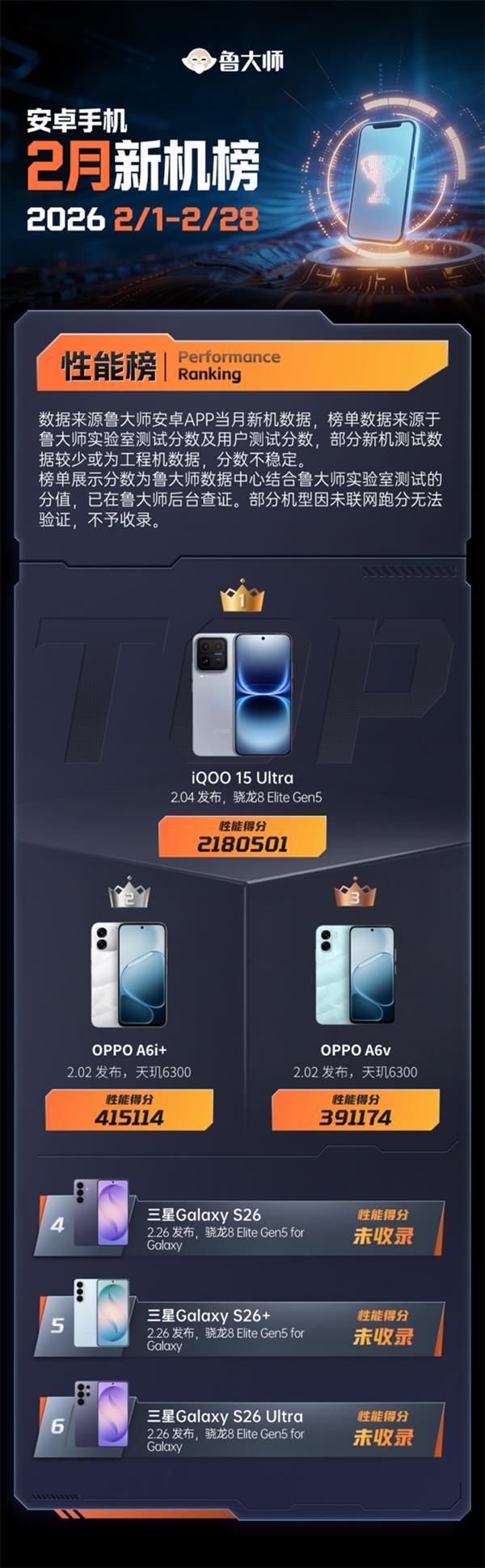本月,蓝厂子品牌iQOO端出了自家首台Ultra超大杯——iQOO 15 Ultra,目标直指“性能王座”;三星也按惯例更新了其Galaxy S26系列,三款机型同步亮相;在更为走量的市场,OPPO则悄然更新了A6系列的两款新成员。接下来,鲁大师就为大家深入剖析,2月手机圈,哪些机型在性能、流畅与AI的赛道上跑出了新高度。