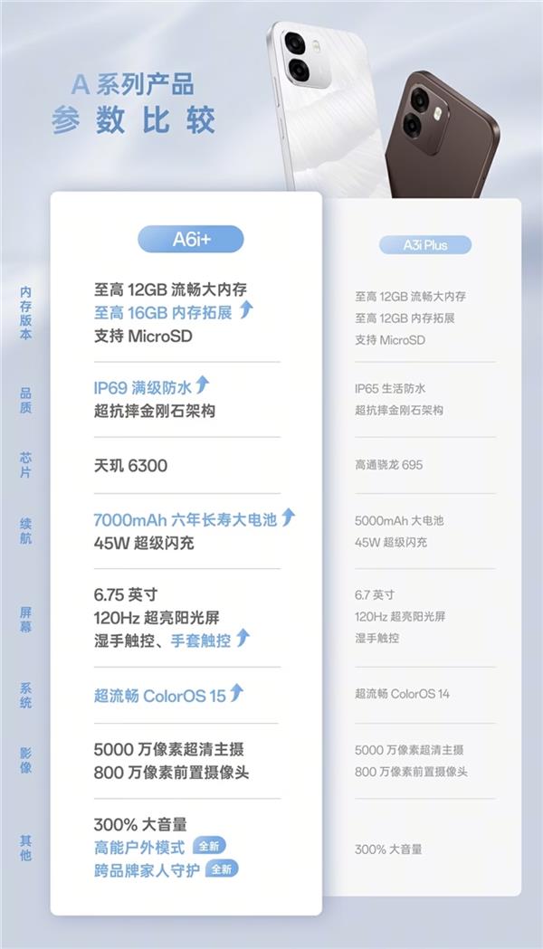 紧随其后的,是来自黑厂的OPPO A6i+与OPPO A6v。它们分别以415114和391174的分数位列第二、三名。然而这个“紧随其后”在分数上却有着天堑般的差距,毕竟这两款新机仅为入门大众机型,也均搭载天玑6300中低端芯片,这配置勉强能满足日常使用和轻度游戏需求。