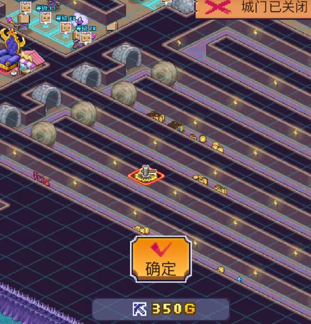 门口附近做几个金币房是比较合适的安排,大概三个左右就够了,再往里就开始转成战斗房,靠歪罗君来击败冒险者,这个节奏整体是比较顺的。如果金币房做太多,路径就会拉得很长,冒险者小队离开的时间变长,新的客人就迟迟进不来,反而会影响整体的赚钱速度,所以不是越多越好。