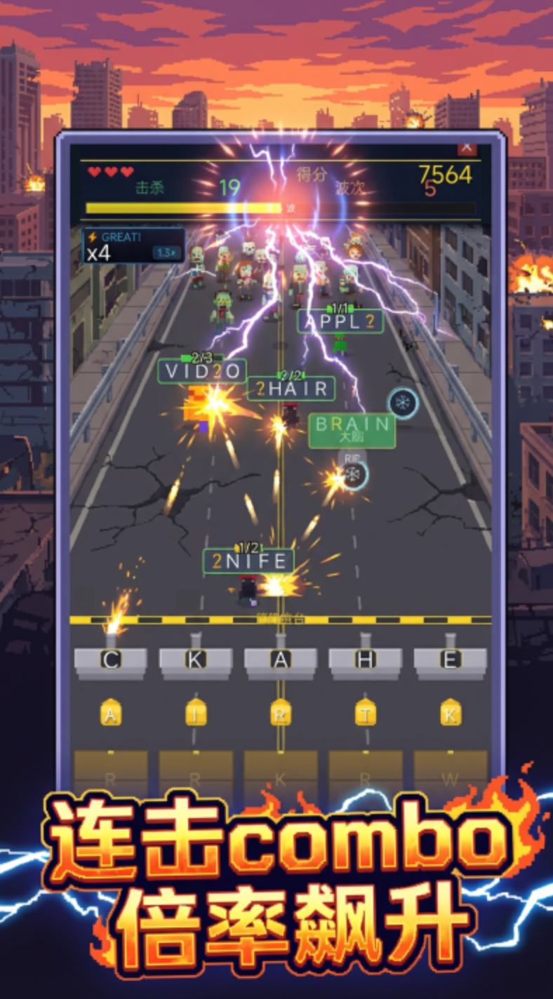 传统的塔防游戏一般是以布置防御塔抵挡敌人进攻的方式进行的,《我用单词打僵尸》在这基础上又加入了单词填空的元素。玩家要用字母炮台去填空,精确射击才是获胜之法。同时又使游戏具有了智力性的特征,把塔防游戏的紧张刺激感与智力挑战结合起来。尤其是当僵尸大军从四面八方蜂拥而至的时候,你不能只顾得反应快,还要努力把每一个动作都做得精准一些,从而尽可能地提升连击的威力,这样才能达到最大的输出效果。连击叠加上去了,不但可以大大增加你的攻击数值,还可以召唤出威力巨大的技能,比如冰冻、轰炸等。因此整个游戏的战斗节奏更加快速、丰富。