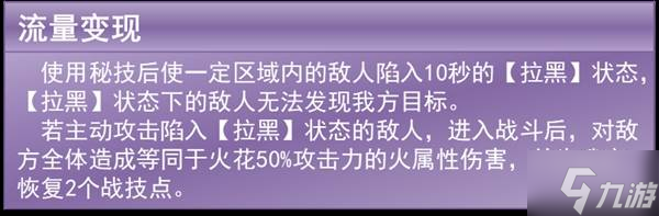 火花是「五星火系欢愉辅C」,是一个需要消耗很多战技点增加输出能力的角色,并且带有提升我方爆伤的机制,是一个欢愉队里面的副辅C的这么一个定位。
