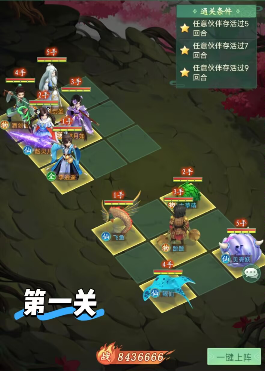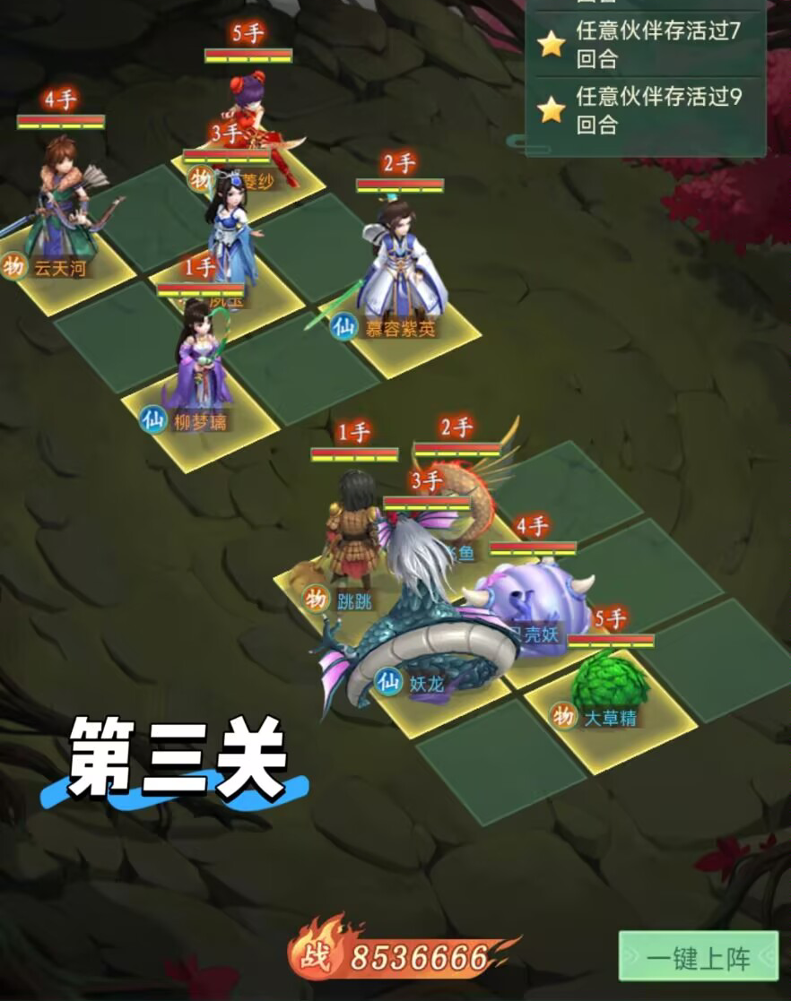 本关难度较低,核心依靠大草精+贝壳妖的双奶回血,搭配飞鱼+跳跳的前排双坦抗伤,守住这四个核心小妖的存活,即可轻松撑过9回合满星通关。