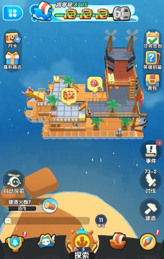 背景设定在海平面上升后的全球淹没时代,仅存零星陆地浮岛与漂浮生态群落。玩家从一艘基础浮船起步,通过模块化扩建不断延展船体规模,逐步集成淡水收集系统、垂直农业舱、水产养殖区及深海探测平台等功能单元。随着探索进程推进,可招募具备特殊技能的NPC加入方舟社区,共同破解海洋生态异变之谜,追寻重启星球生态平衡的关键线索。