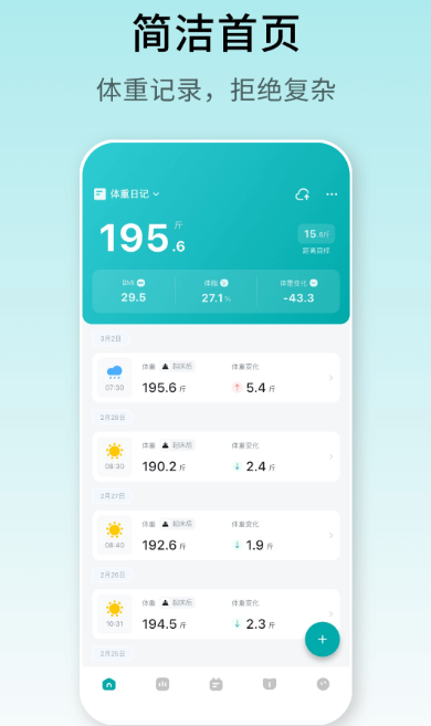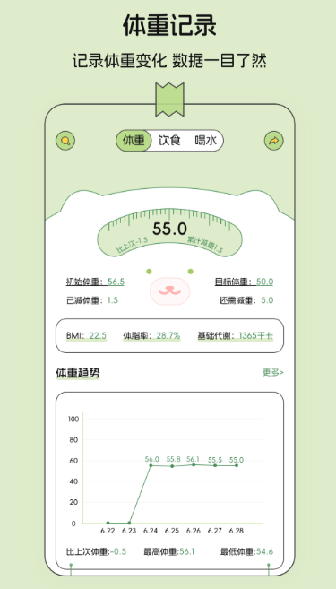 以极简设计语言和人性化交互见长,是注重体验感用户的首选。不仅支持体重、腰围、臀围等多点测量录入,还集成饮水提醒、餐食拍照识别、热量自动估算等功能。其可视化图表清晰呈现周/月/年维度变化曲线,配合低压力打卡机制,避免因数据波动引发心理负担,真正实现轻松记录、理性看待。