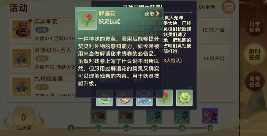 完成挑战后,玩家可获得丰厚奖励:除基础经验值与游戏货币外,还将掉落中级伙伴修炼丹、初级灵露等关键养成材料。尤为值得关注的是解语花——该道具专用于后期妖灵技能升级消耗,稀有度高、需求稳定,建议玩家优先保障每日参与次数,避免资源积累滞后。