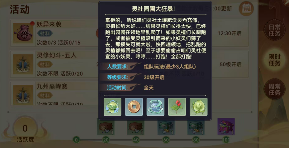 该活动每日固定于12:30准时开启,持续时间有限,仅限单日参与一次。玩家需提前做好准备,在整点前进入游戏界面,确保准时入场。活动入口位于灵社主地图内——此处设有一处专属种植园区,区域内灵植繁茂,受其气息吸引,大量妖灵将在林间游走徘徊。玩家的任务即是在限定时间内,将这些被灵植引来的妖灵成功捕获并带回,完成清剿目标。